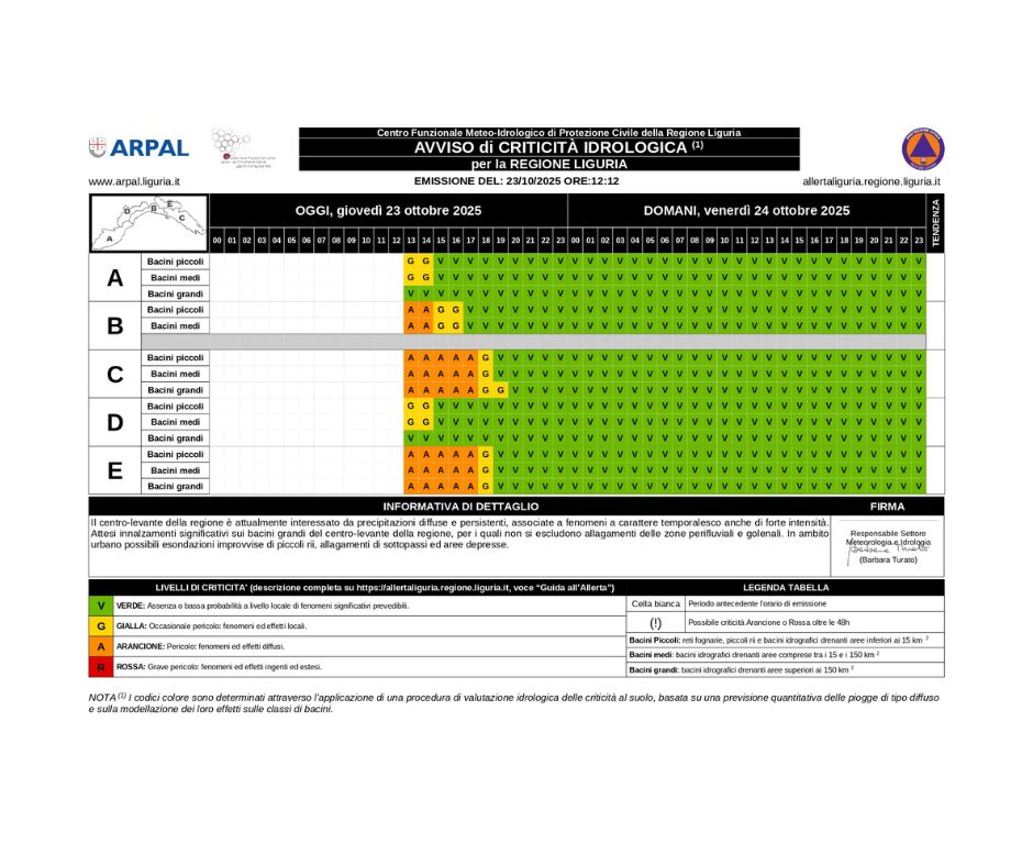 Aggiornamento allerta arancione giovedì 23 ottobre