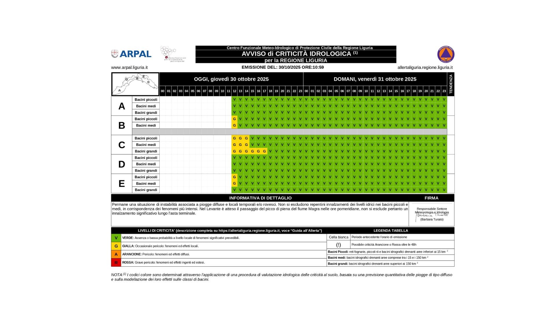 Alla luce di quanto successo e delle ultime uscite modellistiche, Arpal ha prolungato l’ALLERTA METEO GIALLA sui grandi bacini di C, portandola fino alle ore 18.00 di oggi, giovedì 30 ottobre.