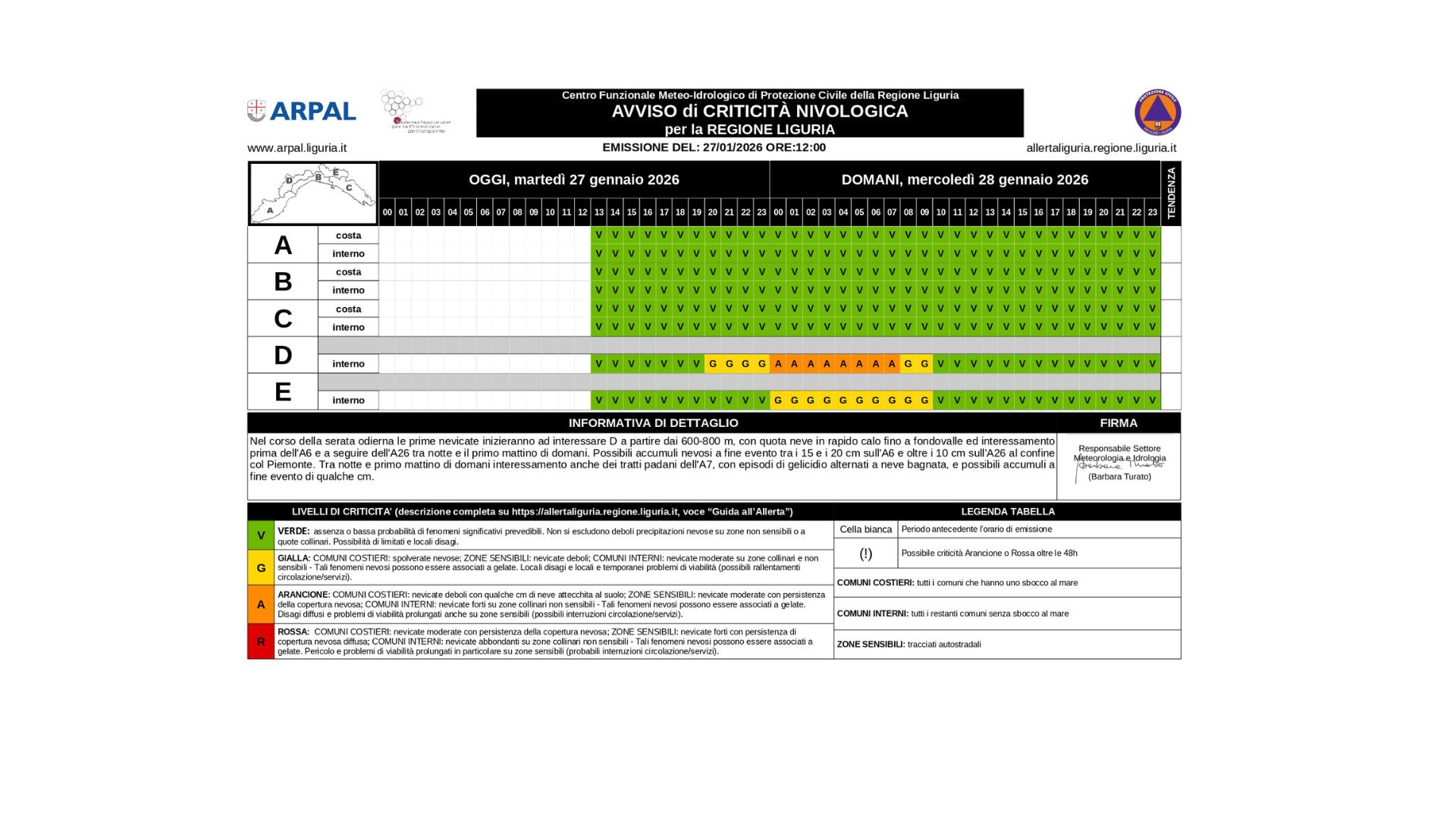 Precipitazioni a carattere nevoso sui rilievi di Centro-Ponente con deboli nevicate su aree non sensibili di D. Moto ondoso in aumento fino a localmente agitato al largo e sui capi esposti.Dalla notte sul Ponente si assisterà ad un abbassamento dello zero termico che porterà nevicate sulla zona D sopra i 400 mt e sopra i 1000 mt nell’interno di A. Sul Centro della regione e su E occidentale saranno possibili fenomeni di gelicidio.