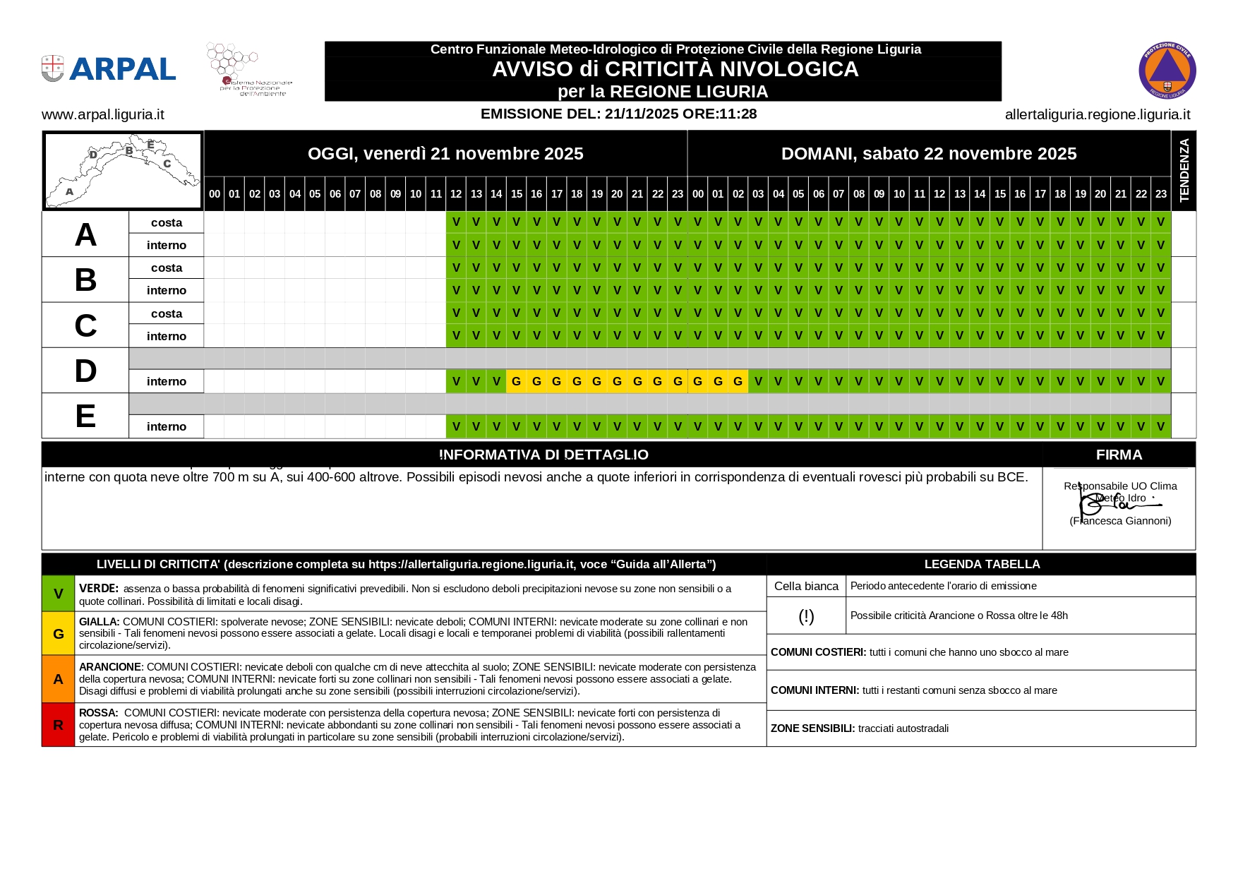 Oggi, venerdì 21/11 si attendono piogge sparse a Levante con qualche rovescio anche associato a grandine o neve tonda con possibili deboli nevicate oltre 800-900 m (zona C). Deboli nevicate fino a fondovalle su val Bormida (zona D), 700 m su Alpi Liguri (zona A), 400-500 m su valle Stura e Scrivia (Zone DE), 700-800 m su val Trebbia (zona E).