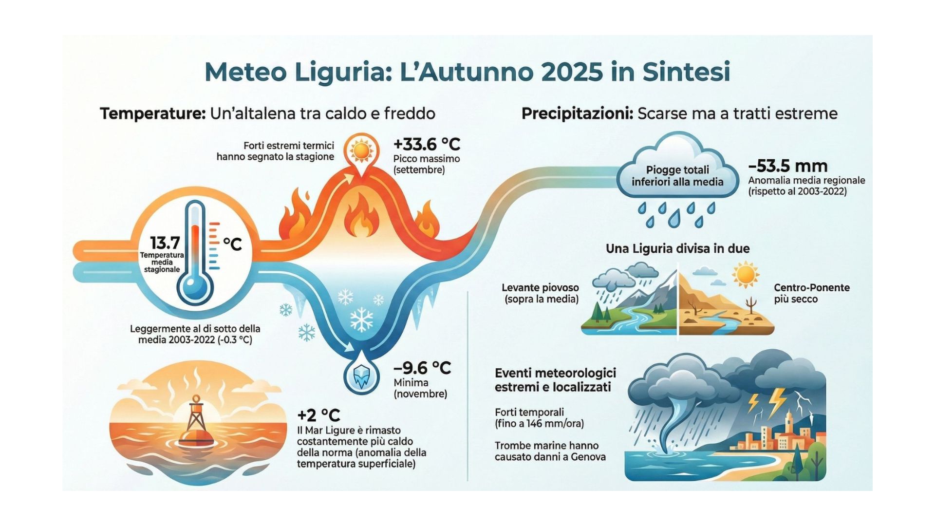 Diversi gli episodi di maltempo intenso, tra cui i temporali di inizio settembre nel genovesato, i fenomeni autorigeneranti del 22 settembre nell’entroterra savonese e il peggioramento del 15-16 novembre, con trombe marine e danni sul capoluogo. Da segnalare anche la mareggiata del 23-24 ottobre, la più significativa della stagione, con onde fino a circa 4,5 metri.