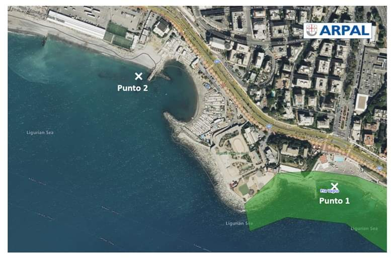 Il primo campione – Punto 1 - è stato prelevato in area balneabile, nel punto di controllo solitamente usato da Arpal per la verifica della balneazione dell’area, denominato “Punta Vagno”: i due parametri analizzati per legge risultano entrambi conformi (inferiore a 10 il valore degli Enterococchi e 20 il valore di Escherichia coli, a fronte di un limite rispettivamente di 200 e 500) e confermano la balneabilità della zona indicata in verde in figura.