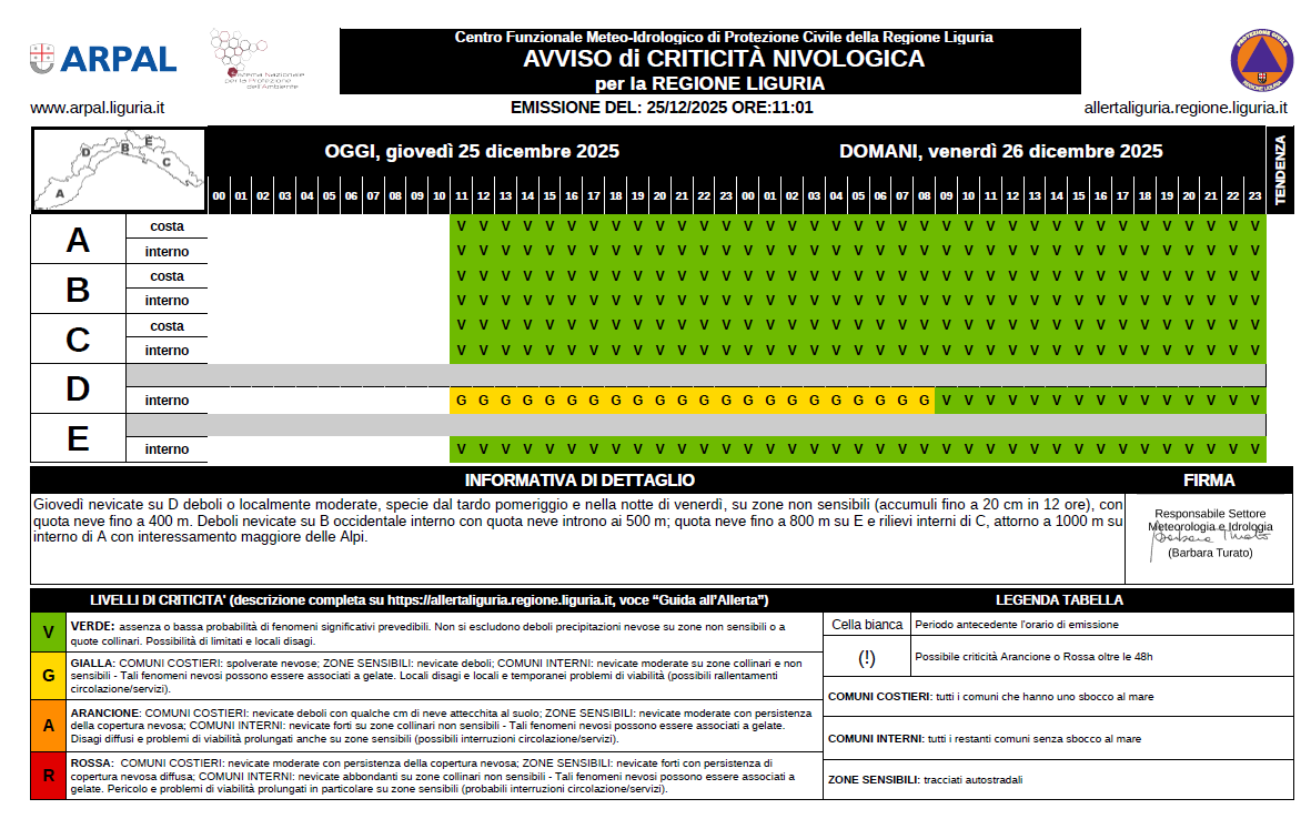 Dal pomeriggio di Natale, specie su Centro-Ponente, le precipitazioni assumeranno carattere nevoso sui rilievi interni e i versanti padani con quota neve anche sotto 600 m e fino a fondovalle su DE. Avremo un nuovo rinforzo della ventilazione da nord con venti di burrasca forte (> 75 km/h) su AB, burrasca (60-75 km/h) su C e forti (50-60 km/h) su E, rafficati specie sui crinali e le vallate esposte. Disagio fisiologico per freddo sui rilievi e aree costiere esposte.